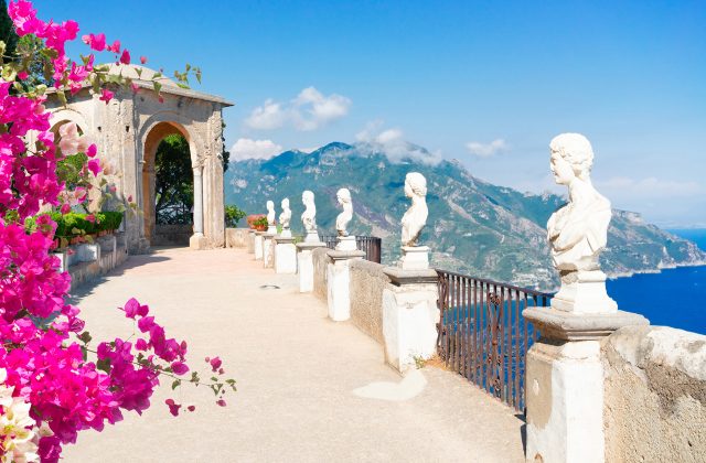 In the centre of the town, on the right of the cathedral, a square tower marks the entrance to the Villa Rufolo, a complex of buildings of the second half of the’200, here you can admire the Richard Wagner terrace, so called because it inspired the garden of Klingsor, the second act of Parsifal, and today you can attend to the Ravello summer Festival. Walking to the top of the promontory you will find the majestic beauty of Villa Cimbrone, built on the foundations of an ancient villa Patrizia, which hosted sovereign and illustrious names of science and politics. In the late 800’s it was purchased by a distinguished English citizen Ernest William Beckett. In 1938 Greta Garbo and Leopold Stokowsky found here the secret of happiness after living the strong outcry of Hollywood. The most important point of the villa is the infinity terrace so called from Gore Vidal for his majestic opening above the horizon.