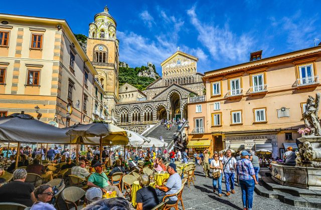 Driving down hill we arrive in the famous town of Amalfi, founded by Romans, thanks to its maritime traffic and it become in the IX century one of the richest and important Sea Republic in the Mediterranean extending their domination all the way to the Middle East. The Duomo is certainly the most famous monument, Arabic, Byzantine, Moorish and Baroque style, realized in the IX century and dedicated to the patron St. Andrew. The bronze facade portal where made in Constantinople in 1066 and dominate the main square with its staircase. Next to the Cathedral you will enter the charming Amalfi Chiostro del Paradiso, where the archbishop Capuano built the Cript to accommodate the remains of the St. Andrew Apostle.